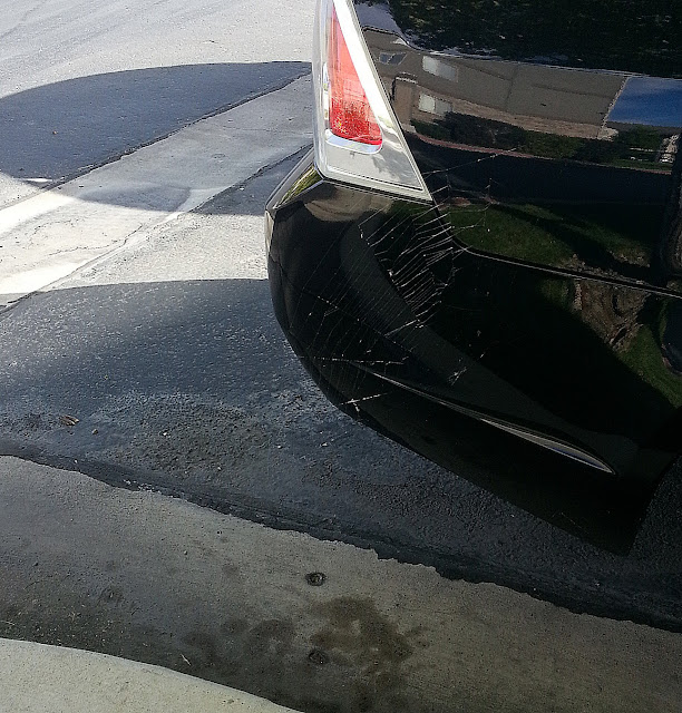 There is an eentsy-weentsy spider that instead of going up the water spout, goes to work making intense webs every night. There's always a huge web between my car and a tree or my car and the car next to it every morning when I come outside. You can't see it very well in the picture, but it's crazy huge, only to be destroyed every day when I leave. I feel bad for the poor little fella cuz he clearly tries so hard.