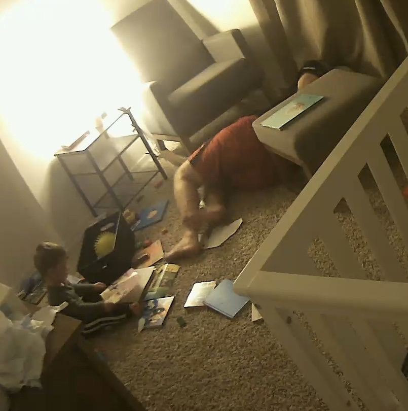 Cooper says, "I'm fummy" when we're laughing. It's so cute. Anyways I was spying on them one morning because dallin wakes up with coop while I'm still getting ready for work and I thought it was hilarious that he just passed out on the floor and coop's doin his thing.